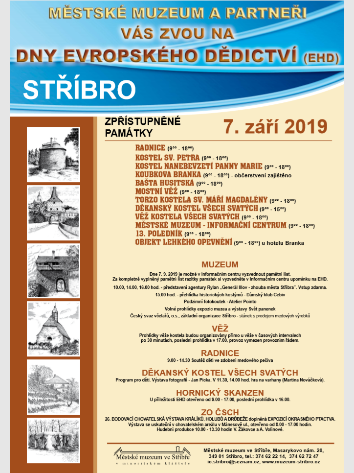 ne 7 září budou opět zpřístupněny památky města. Můžete vyjít na věž Děkanského kostela Všech svatých, navštívit muzeum, nebo Hornický skanzen. U hotelu Branka bude zpřístupněn objekt lehkého opevnění. V infocentru si vyzvednete pamětní list a za kompletně vyplněný - razítky památek - si vyzvednete v IC. drobnou upomínku na EHD. Celý den bude zpestřen zajímavým programem. Dámský klub Cebiv předvede historické kostýmy, agentura Ryllan představí generála Illova jako zhoubu města. Na památku se můžete vyfotit ve fotokoutku ateliéru Pointo.