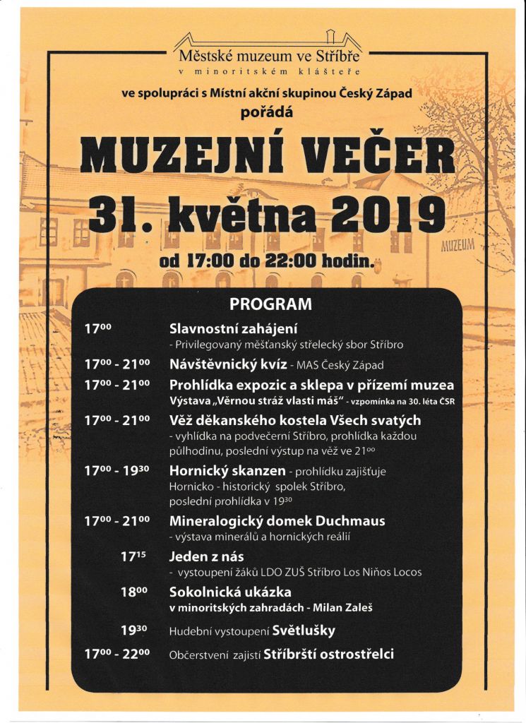 Městské muzeum ve Stříbře pořádá ve spolupráci s MAS Český Západ MUZEJNÍ VEČER. Privilegovaný měšťanský sbor slavnostně zahájí tuto akci výstřelem a pak už můžete ověřit svoje znalolosti v návštěvnickém kvízu, zajít na Věž děkanského kostela Všech svatých, nebo si vybrat z dalších možností nabízeného programu.