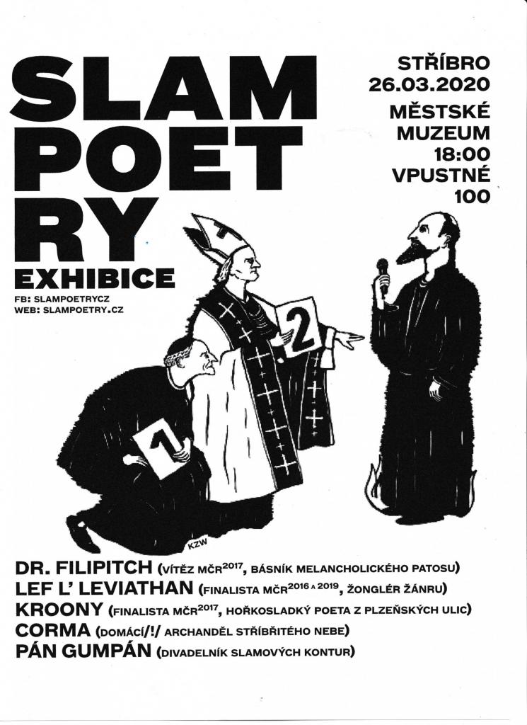 Po druhé přivítáme ve víceúčelovém sále našeho muzea Slam poetry. Účinkující : Dr. Filipitch, Corma, Pán Gumpán a Lef l´ Leviathan